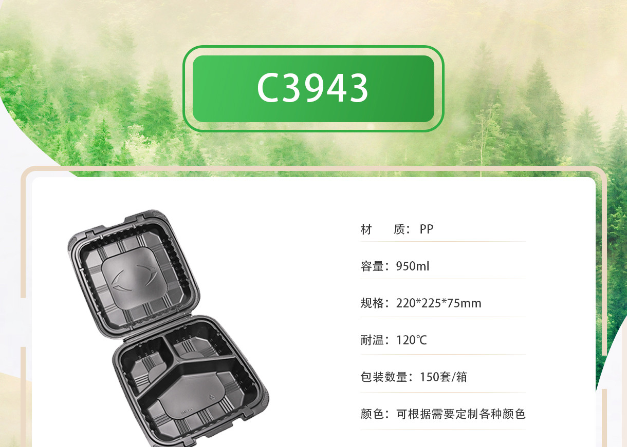 一次性pp饭盒带盖封口黑色方形三格格快餐盒